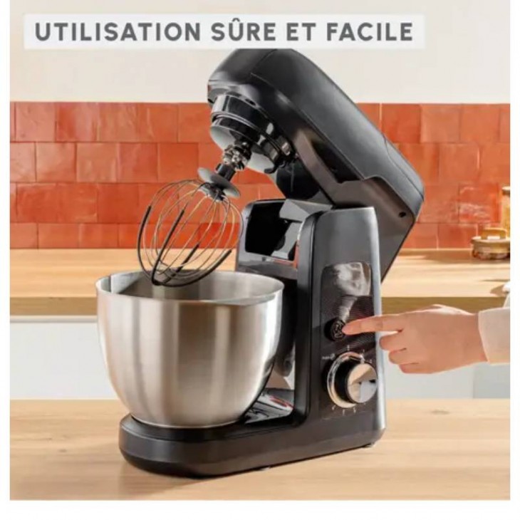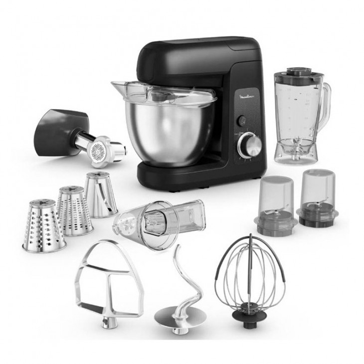 Robot Pétrin Multifonction MOULINEX - Puissance: 1100 Watts - Capacité du bol: 4.6 litres - Matériel de bol: Acier inoxydable - Nombre de vitesses: 8 et Fonction pulse - Mouvement planétaire - Capacité du blender: 1,25 litres - Accessoires compatibles au lave-vaisselle - Couvercle anti-projections - Accessoires: Robot pâtissier, Fouet souple, Batteur, Crochet pétrisseur, Blender, Hachoir à viande, Râpe (3 cônes), Mini hachoir - Couleur: Noir - Garantie: 1 an