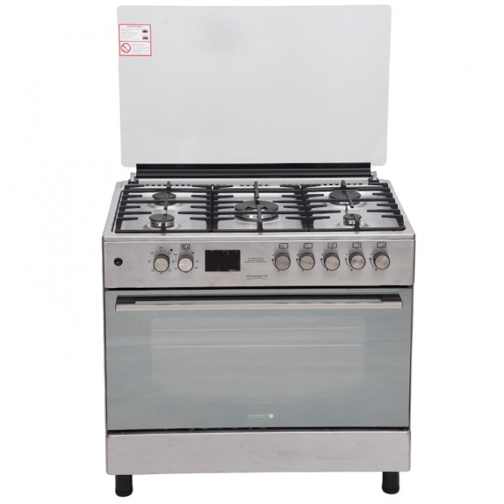 Cuisinière à Gaz Arthur Martin AME90IX - Nombre de feux : 5 Feux - Largeur : 90 cm - Couvercle en verre - Gilles en fonte - Plateaux sur railles - Allumage table automatique - Afficheur avec minuterie électronique - Sécurité thermocouple - Four chaleur tournante multifonction - Thermostat réglable - Eclairage four - Porte four double vitrage amovible - Gaz butane ou gaz naturel - Facile à nettoyer - Couleur : Inox - Garantie : 1 an